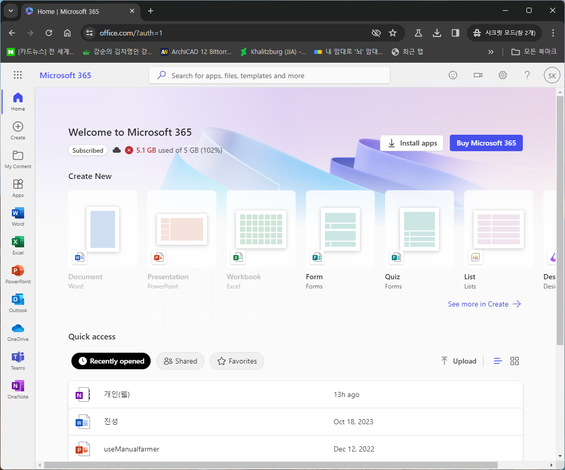 - MS Office : 클라우드 내에서 제한적으로 무료 사용 가능. 365 결제 시 더 많은 기능 사용 가능. (Microsoft 계정 필요)
